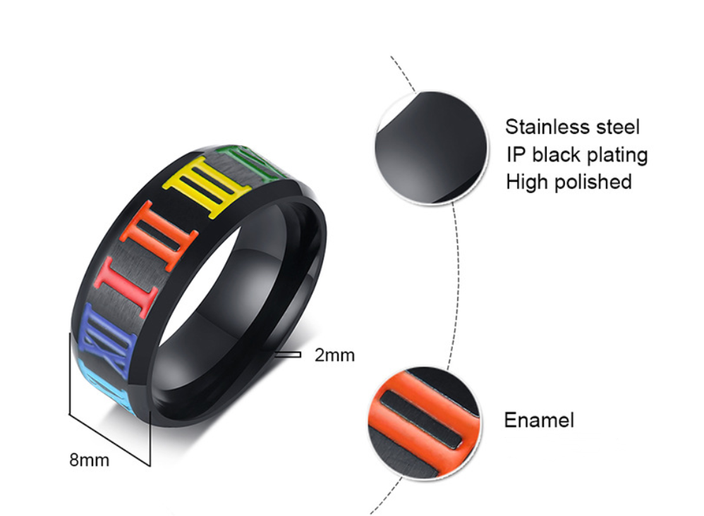 Elevate your style with our 8MM Titanium Steel Roman Numeral Rainbow Ring. Designed for the bold and modern individual, this ring is more than just an accessory; it’s a statement of pride and identity. Crafted from high-quality titanium steel and finished with an exquisite electroplating process, this ring combines durability with a unique aesthetic.